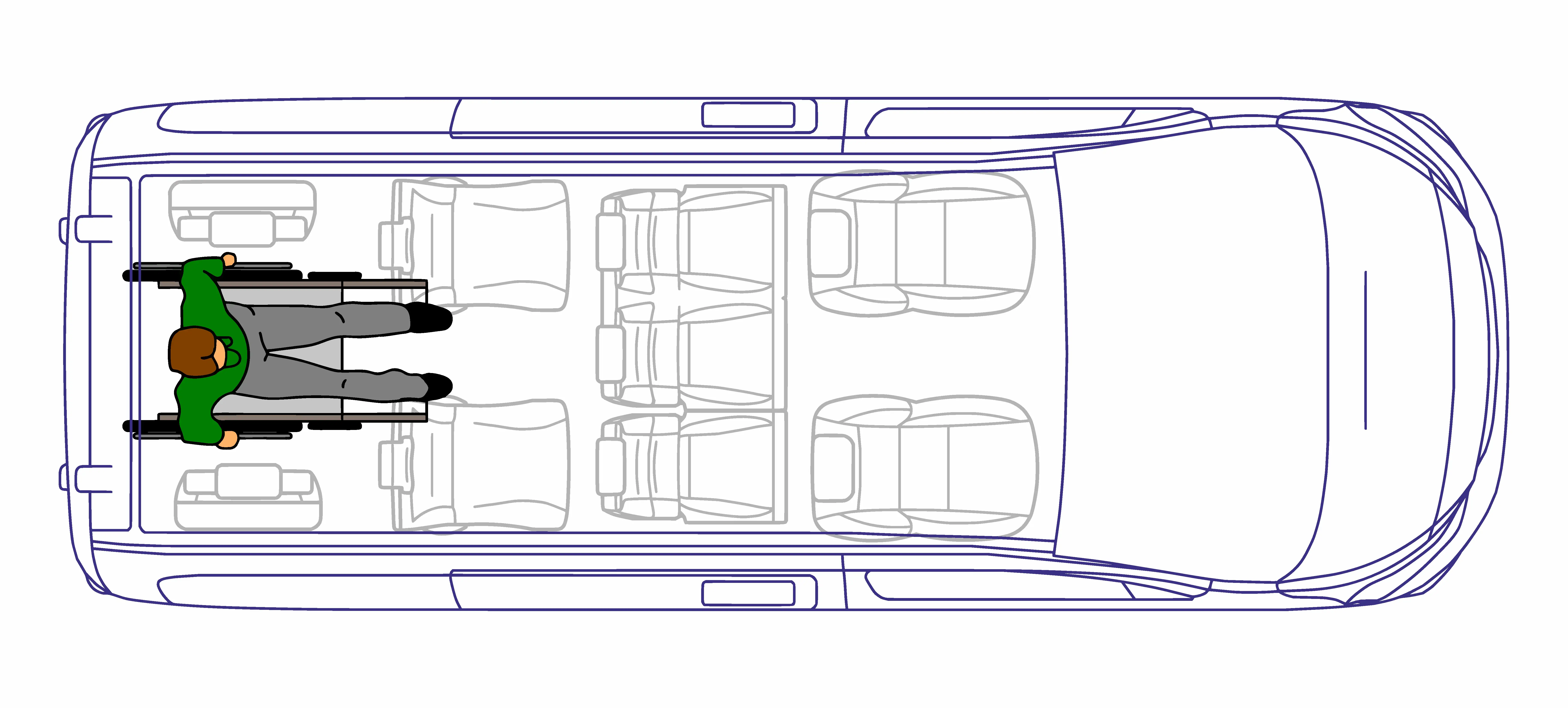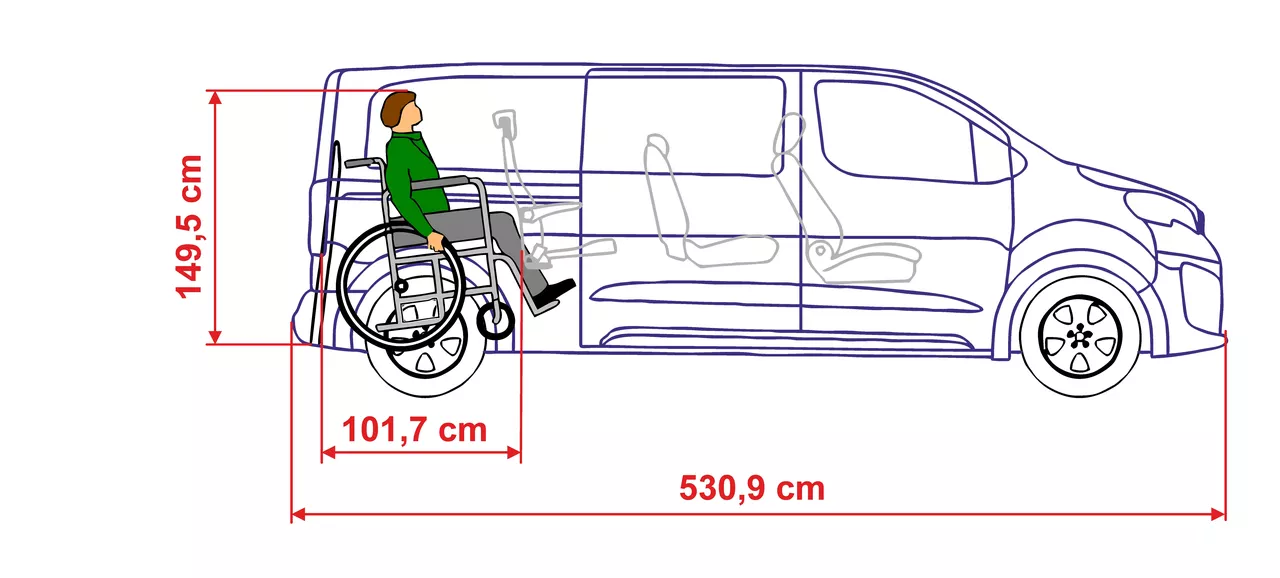 Konwersja Tripod Mobility (WAV) z krótką obniżoną podłogą Peugeot Traveller i Peugeot Expert Combi w wersji Long (530,9 cm).